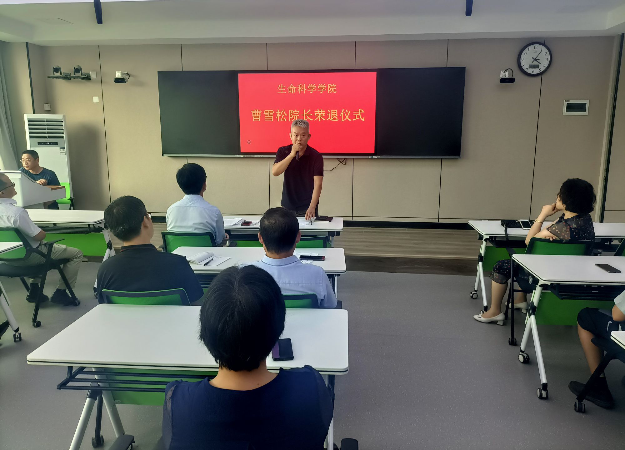 7月1日,生命科学学院于东校区2#405举办曹雪松老师荣退仪式。生命科学学院党委书记张金保,院长贾泽峰,党委副书记、副院长李晓鹏,副院长徐伟、王春明,学院分工会主席杨洪双及学院全体教职员工与学生代表参加了仪式,仪式由张金保主持。