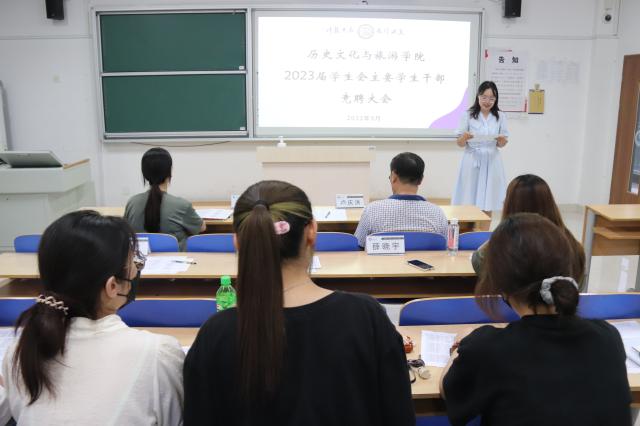 为了真正体现公开、公平、公正的原则,将更多素质高、能力强的同学融入到学生组织当中,9月9日晚,历史文化与旅游学院于6#A503举办2023届学生组织主要学生干部竞聘大会。院党委副书记卢庆洪,团委书记石晓晗,辅导员辛超、薛晓宇及部分学生组织成员参加,主席团成员李雪主持本次会议。