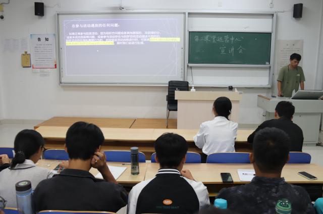 第二课堂是学校人才培养的重要途径和有机组成部分,是学生德智体美劳均衡全面发展的重要手段。培训会上,侯孟森同学针对第二课堂成绩单的制度体系、模块分类、积分获得、参加活动注意事项等四大方面对第二课堂展开了详细的讲解。第二课堂可以客观记录、有效认证并科学评价学生参与活动的成果,直接影响到大学毕业等一系列问题。因此,主持人鼓励同学们认真规划部署,积极参与第二课堂活动项目。为使新生更加便捷地了解到梦空间各项信息,侯孟森同学就到梦空间如何注册、如何报名活动以及录取规则与进度等各方面的注意事项向新生进行全面周到的解说,并特别强调了活动签到以及诚信分的注意事项。主讲人提醒学生们务必重视起来,认真、诚信参加各类活动,充分发挥第二课堂的作用,并祝福各位同学们拥有一个丰富充实的大学生活。
