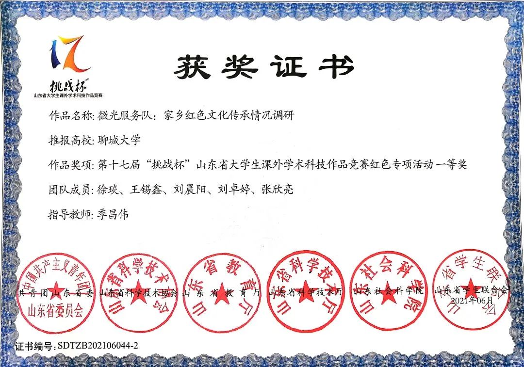 第三,团支部紧扣主旋律,积极组织并开展一系列红色主题专项实践活动。支部成员前往革命老区,多次开展社会调研活动,传承红色精神。其中,团支部书记主持负责的红色作品《微光服务队:家乡红色文化传承情况调研》荣获山东省第十七届“挑战杯”大学生课外学术科技作品竞赛红色专项活动一等奖。