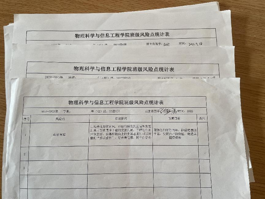 为更好的发现和解决学生在思想道德、专业学习和心理健康等方面的问题,同时为了更好的指导班主任和辅导员的工作,防患于未然,有效降低校园风险事件发生的概率,物理科学与信息工程学院对所有班级进行风险点统计分析。