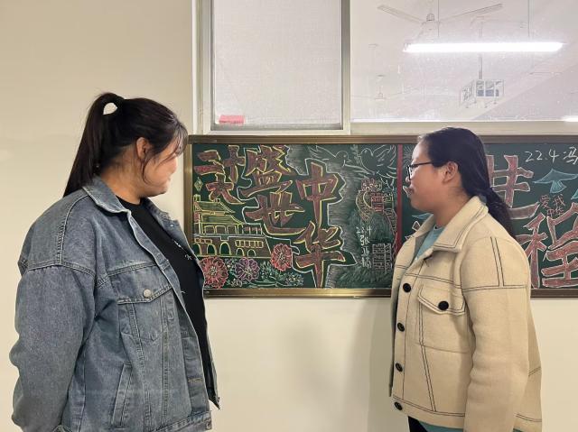 活动初期,同学们认真积累党的二十大相关的知识,仔细思考黑板报的创作方式,为绘画黑板报做好充足准备。同学们摩拳擦掌,跃跃欲试,秉持“画以载道、画以寄情”的信念,用粉笔一笔笔描绘自己对党的二十大召开的喜悦之情。创作过程中,部分同学选用单线与色块相结合的画法,灵活运用“党徽”“五星红旗”“天安门”等意象,生动形象地描绘出新时代中国的繁荣兴盛。同学们直抒胸臆,通过刚劲的笔迹,写下“学习党的二十大”“盛世中华”等字,字里行间既包含了对中国共产党带领人民取得的巨大成就的自豪,也包含着对中国在新的历史条件不忘初心、踔厉奋发的满心期待。还有同学运用“牡丹花”“长城”等形象,合理排版,烘托主题,将栩栩如生的图画和感动人心的文字结合起来。最后,在黑板报评选中,王静、张亚楠荣获一等奖,杨瑞倩、王欣冉、陈欣怡获得二等奖,姚洁洁、张天亚、宋映柳等同学获得三等奖。同学们表示此次活动不仅加深了他们对党的二十大的认知,更加坚定了自身对祖国的热爱和对强国复兴的信心。