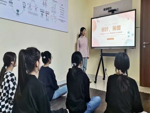 主讲人分别从瑜伽是什么、练习瑜伽的好处、如何看待瑜伽、练习瑜伽的注意事项四个方面详细展开讲述,刘雅琪提出把瑜伽当作一种以一定心理实践为基础的生活哲学,能够发展身心之间的理想平衡,从而有效缓解压力和紧张感,获得力量、柔韧性和平衡性,提高身体能量和精神能量。她着重讲述了对瑜伽的认识误区,指出青少年阶段是练习瑜伽的最佳年龄阶段,有助于提高身体柔韧性,促进身体生长发育。在刘雅琪讲解完练习瑜伽的注意事项后,她带领全体成员练习了简易坐、至善坐、雷电坐、山式和拜日式站姿等动作,伴随舒缓的轻音乐,同学们在冥想中放松自己,享受瑜伽带来的舒适感。在交流分享环节,于双双表示,在此次活动中深刻感受到了瑜伽的魅力,暂时忘记快节奏的生活,身心得到充分的放松。