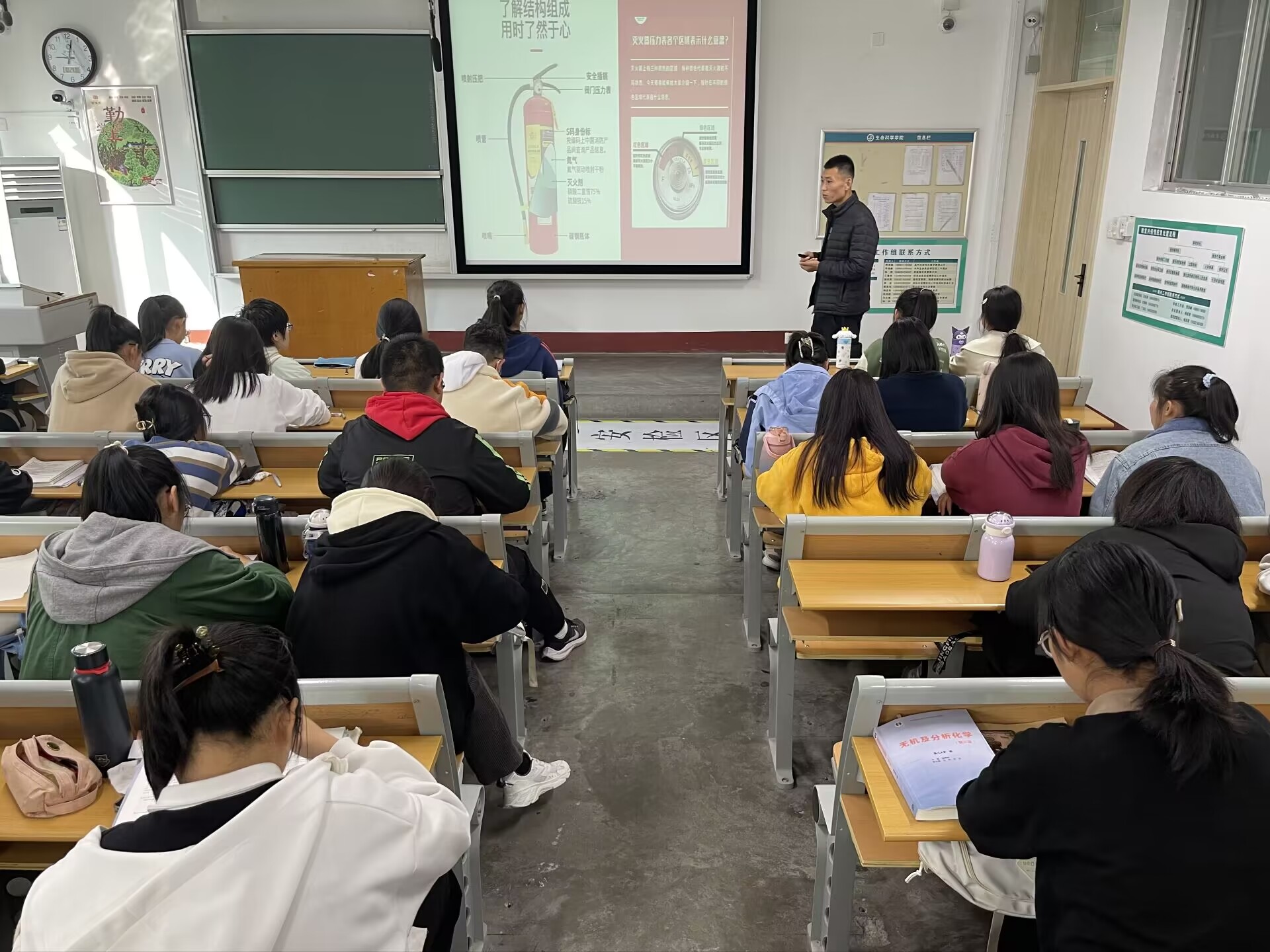 火灾对于人身财产安全的威胁是巨大的,消防安全的重要性主要在于保障人民群众的生命财产安全。此次讲座主要从消防安全常识、消防设备的使用、实验室安全以及火灾发生时应该如何自救四个方面进行讲解。任庆超首先介绍了火灾发生的时间特点:在一年中,发生火灾最多的时候是春节期间;在一天中,火灾高发的时间是18点至22点;在四季中,春季和冬季是火灾多发季节;而在日常生活中,节假日是火灾高发期,并以大学校园真实案例的形式向同学们说明了防火用电安全的重要性,当火灾发生时,同学们应保持冷静及时拨打119报警电话,清楚报出火灾发生位置以及燃烧物质,并通过相关灭火常识利用就近灭火器先行灭火。随后任庆超为同学们详细介绍了火灾的正确预防和应对措施,对如何树立公共消防意识、预防可能引起消防事故的内外隐患、个人面对突发火灾事故应如何进行救灾及逃生等进行了细致的讲解,同学们认真听讲并写下笔记。讲座结束后,同学们纷纷表示收获良多,直接深刻地认识到了消防安全的重要性和必要性,完善了消防安全思维,增强了消防安全意识感和责任感。