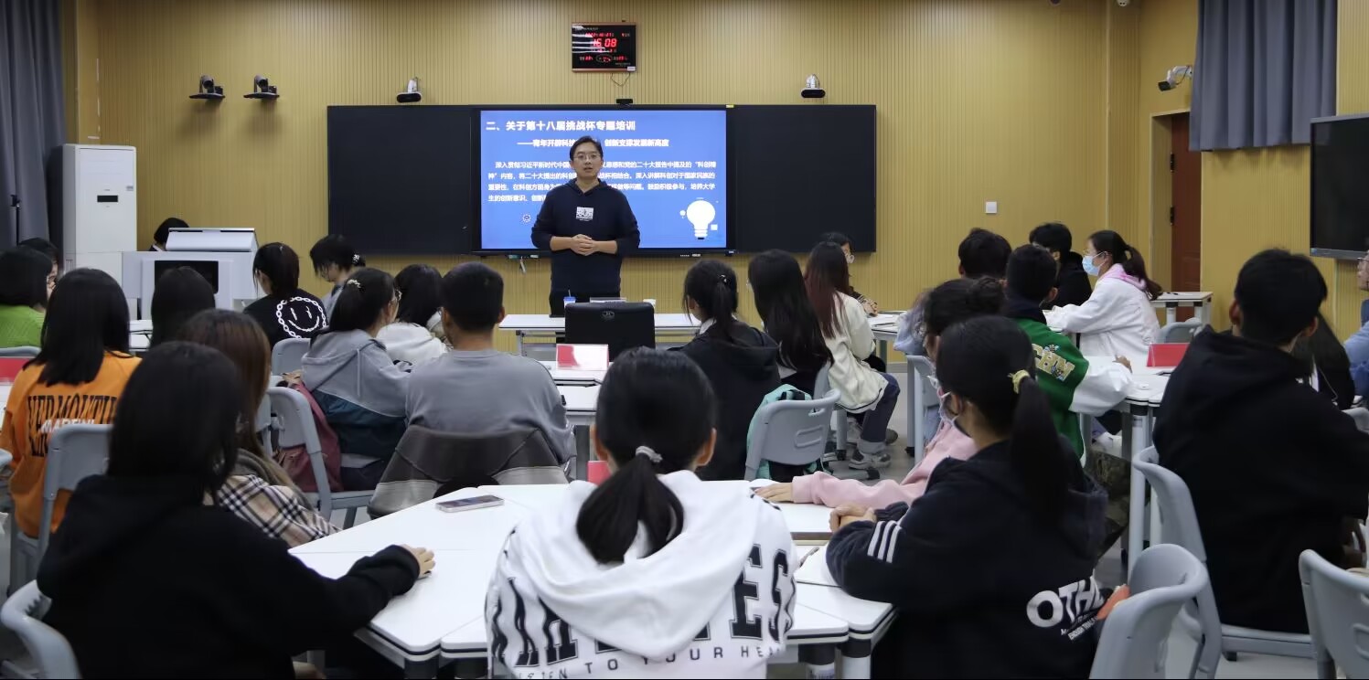 随后,倪鹏老师就第十八届挑战杯的比赛形式和内容展开讲解,以我国现行的一些科创政策为例,鼓励同学们积极响应党的科创号召,争做科创先锋。倪鹏老师根据我院同学的具体情况提出培养方案,指出同学们可以多向人文社科领域靠拢,采用社会调查报告和学术论文等形式开展科创项目,为同学们开辟科技新赛道指明方向。为加深同学们对挑战杯赛事的理解,倪鹏老师鼓励同学们进行小组讨论,同时,针对同学们提出的疑问给予耐心解答。活动最后,孙孟轩同学分享我院挑战杯案例,通过成功的科创案例加强同学们对挑战杯的兴趣与信心,鼓励同学们积极参加科创比赛。