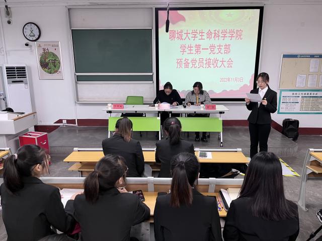 11月3日,生命科学学院学生第一党支部于聊城大学东校区2#416召开全体党员大会,讨论接收杨子涵、李晓静等18名同志为中共预备党员。会议由生命科学学院团委书记、学生第一党支部书记李岩主持,支部委员任庆超、金含等党员以及全体党员发展对象参加。