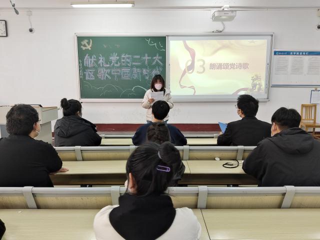 此次活动围绕知识宣讲、诗歌赏析、诗歌朗诵等环节展开,学习党史朗诵诗歌,不忘初心砥砺前行。活动过程中,2022级学生赵奕晨通过播放建党历程视频,讲述中国共产党的百年历史征程,带领在场学子回顾中国共产党建立之初的艰辛过往与领导中国人民走向光明的奋斗经历,领略中国共产党永不懈怠的斗争精神与一往无前的奋斗姿态。“有位舵手操起舵轮,矫正了那船的航向”,赵奕晨围绕颂党诗歌《红船,从南湖起航》进行赏析,表示诗句描写出中国革命从红船扬帆起航,孕育开天辟地、敢为人先的首创精神,体现出中国共产党为实现中华民族伟大复兴作出的重大贡献,指引在场学子坚定理想信念,担负起时代赋予的责任与使命。在此基础上,在场学子结合《我爱你中国》背景音乐,朗诵《献礼党的二十大》诗歌,歌颂中国共产党的丰功伟绩和不畏艰辛、百折不挠的奋斗精神。