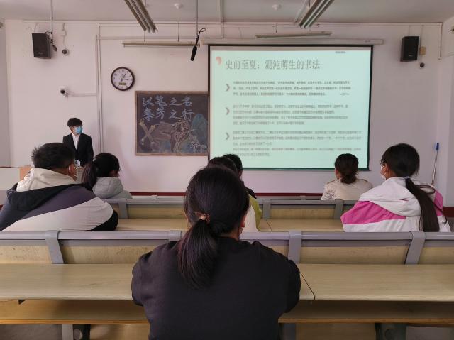 此次活动围绕知识宣讲、游戏互动、书法创作等环节展开,展示书法魅力,陶冶学生情操。活动过程中,2022级学生贾桂华结合李斯、柳公权、王羲之等历史书法家的书法作品,向在场学生讲解中国书法的起源及中国文字由甲骨文到行书的演变过程,强调书法在专注品质养成、观察能力培养等方面具有重要作用,呼吁在场学生积极参与各类书法活动,注重培养良好书写习惯。在游戏互动环节,在场学生依照场内位置分为四组,以诗词接力形式完成以数字、花、海、月等为关键词的飞花传令,进行诗词储备、临场反应与心理素质的综合较量,展示板书水平,彰显文化功底,感受传统诗词魅力,增强中华文化自信。同时,在场学生借助自身储备的书法知识,不骄不躁,沉着冷静,在规定时间内完成《长歌行》、《扬子江》、《琵琶行》等书法作品的书写,提升艺术修养,培养审美情趣,提高鉴赏能力,丰富情感体验。