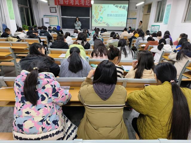 徐东阳首先强调了学院合唱团的独特定位,即要打造一支有人文情怀的特色合唱团,立足学院特色,让合唱团成员综合了解艺术学习与创造的过程。徐东阳用优美的歌声、生动的讲解,深入浅出地对声乐演唱技巧、训练方法等进行专业指导,进行了别开生面的培训课程。同学们首先进行开嗓练习,为接下来的歌唱做好准备。伴着熟悉的钢琴旋律,同学们借助“mima”进行发音练习,以找到合适的发音方式。开嗓练习结束后,徐东阳要求同学们温习上次学过的歌曲《菊花台》,以追求熟能生巧的效果。首先由男生合唱低音部,随着钢琴声响起,徐东阳为同学们开唱了首句,声音浑厚有力,同学们紧接其后,现场男低音浑厚庄重、富有磁性。由女生合唱高音部,伴着升调的钢琴声,女高音婉转悠扬,清亮动听,相比低音部的浑厚庄重,女高音更加清脆嘹亮。随后,同学们练习了歌曲《夜空中最亮的星》,分为三个声部进行合唱。合唱结束后,徐东阳老师指出同学们存在的问题,如某一音节发音不准、某个音部出现抢拍现象等问题,并根据现场实际展示的情况耐心教导。在多次专业培训中,合唱团成员以积极的态度向老师学习乐理知识,同学们训练刻苦,以昂扬饱满的态度练习培训曲目。经过多次训练,依靠老师的耐心指导和学院的大力支持,合唱团的水平取得了极大进步。