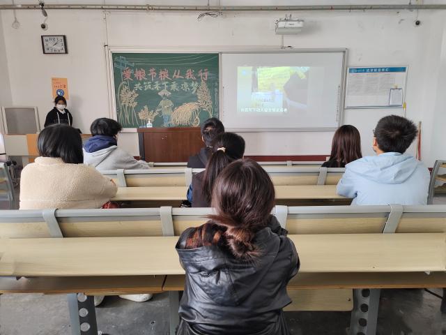 此次活动由节粮背景探讨、海报作品分享两部分组成。活动前期,学生利用网络平台自行查询相关资料并进行海报设计。活动过程中,2022级学生何佳颖借助纪录片《“杂交水稻之父”袁隆平寻稻之路》带领在场学生回顾研究杂交水稻的艰难险阻,激励在场学生提高珍惜粮食认识,践行绿色生活方式。“一粥一饭,当思来处不易;半丝半缕,恒念物力维艰”,2022级学生孙艺菲指明目前在校学生珍惜粮食意识较为淡薄,仍然存在浪费粮食的现象,强调要增强珍惜粮食的危机意识,培养厉行节俭的忧患思维,坚持适度选择、按量取餐,切实缓解粮食浪费问题。在海报分享环节,设计者围绕“节约从粮食开始”这一主要内容通过互动问答的方式讲解海报创作理念,表明粮食节约是最基础、最根本问题,号召在场学生以知为行,坚决抵制和反对浪费粮食的行为,养成爱粮节粮的良好习惯,做勤俭节约的践行者。