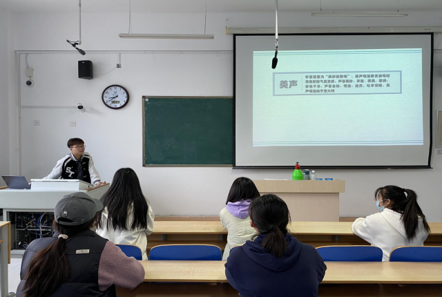 活动开始主持人首先以欣赏不同地区的音乐做导入,引出本次活动主题,再用音频、视频、讲解交叉进行的方式向同学们生动展示地区音乐的特色。在音乐教学方面,主持人重点讲述唱法,加以对曲风的讲解,同时结合不同国家的音乐发展史和地区音乐的发展特点、使同学们进一步加深对地区音乐的了解,感悟到不同地区音乐独特的艺术魅力。许多同学在主持人的鼓励下积极上台表演,黄佳兆演唱的《小幸运》唱法独特、感情真挚,赢得众多赞美之声。为检验本次活动成果,在活动结尾,主持人邀请两位同学在今天学习的知识基础上演唱不同地区的音乐,陈秋月演唱的《我和我的祖国》,将对祖国的热爱通过美声表达出来。胡俊涵演唱的《广寒宫》融入了戏腔的唱法,使情感更加丰富。活动最后,主持人通过对两位同学的精彩表现进行点评,加强了同学们的音乐的理解。