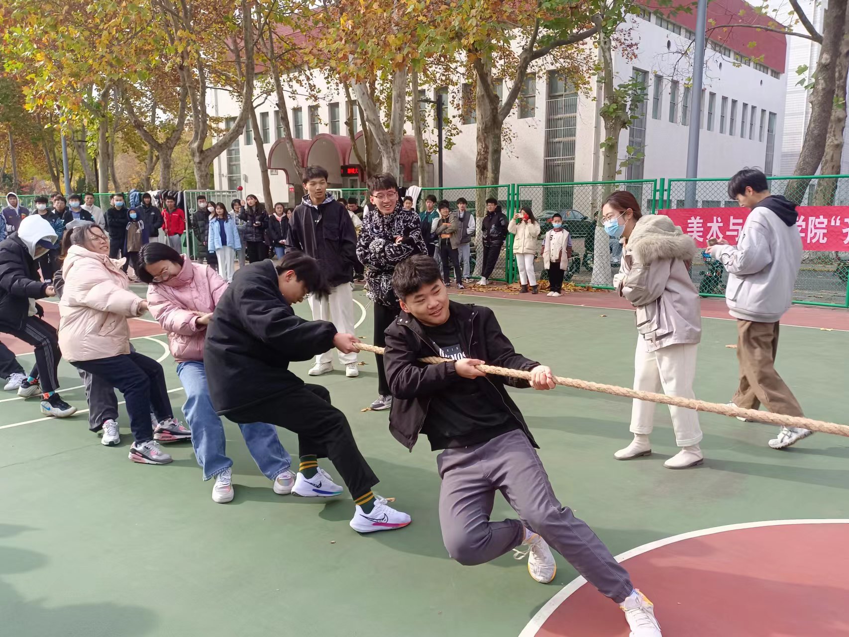 为丰富学生的精神文化生活,发扬团队精神,巩固凝聚力,锻炼健康身体,展现学生们积极向上的精神风貌,11月13日,美术与设计学院于西校区篮球场举办“齐心协力 永争第一”拔河比赛,2022级各班代表队参与本次比赛。