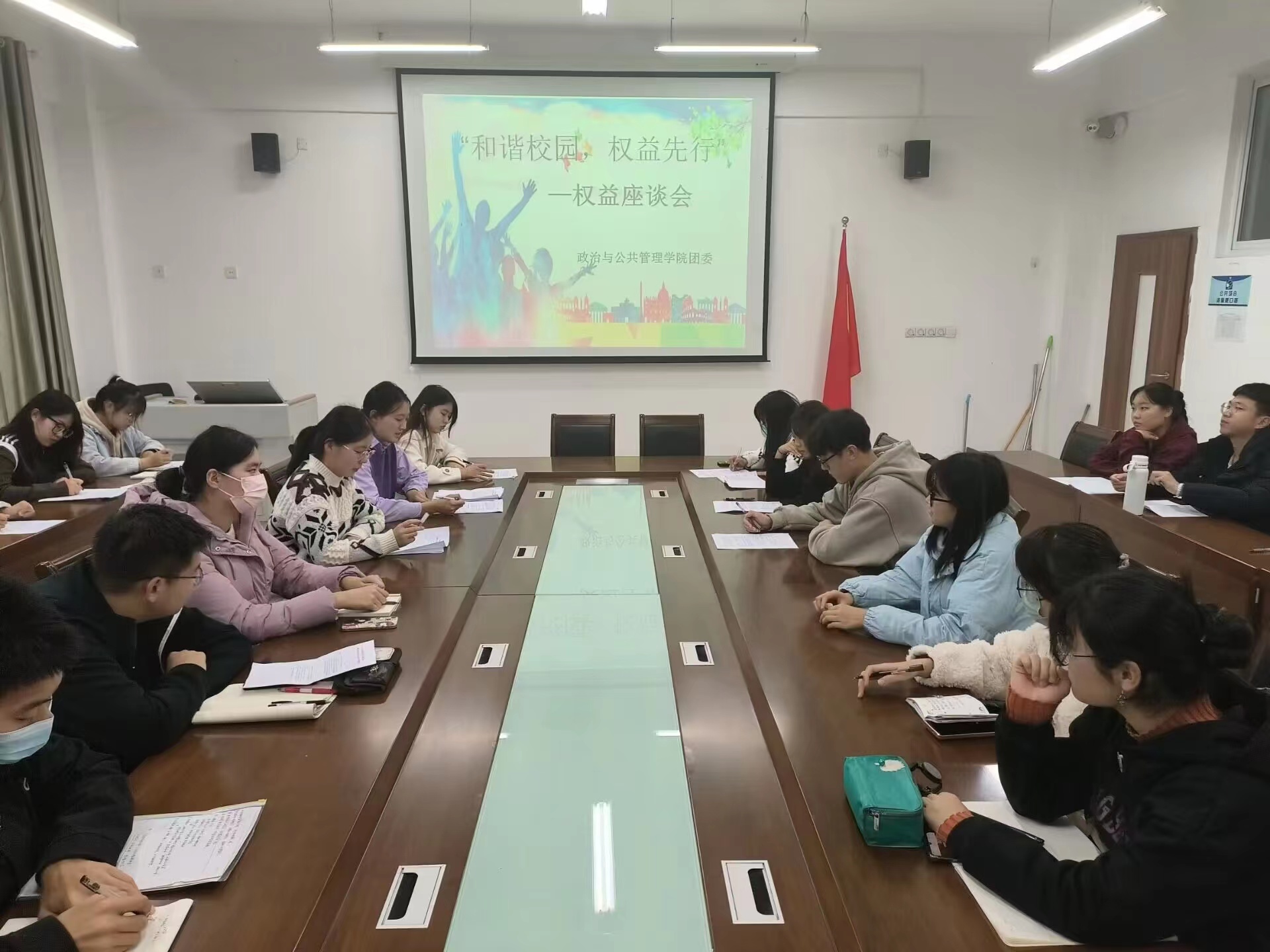 11月15日,政治与公共管理学院于东校区6#C302举办“和谐校园 权益先行”学生权益座谈会。本次座谈会由政治与公共管理学院学生会权益服务部主办,各班级权益委员参会。