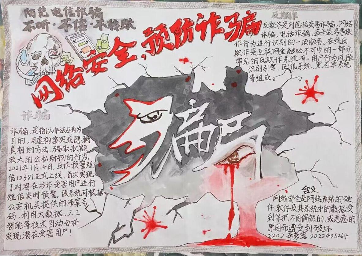参赛学生用绘制手抄报的方式表达自身对防范诈骗的见解和对维护自身权益的看法。吕佳玉的作品构思新颖,采用“反诈日报”的创新形式,通过简洁的版面和醒目的标题对反诈知识加以强调,以生动风趣的语言引导学生们重视电信骗局。杨荣婷在作品中以金币和互联网为背景,手机屏幕外一只带着手铐紧握钞票的手,象征电信诈骗的诱惑性与危险性,突出展现当今“互联网+诈骗”的诈骗形式,主题鲜明,设计巧妙,极具讽刺意味。李蓉蓉选用黑色和红色为主色调,凭借精妙的绘画技巧,将诈骗犯丑陋的嘴脸与电信诈骗受害者悔恨的血泪两种形象与“骗局”二字相结合,警示同学们重视网络安全。在张博雅的绘画中,“电话的另一端是鱼钩”的巧思比喻其背后的电信骗局,一则短信领取优惠券购买高额商品最终上当受骗的案例分析,更是反映出电信诈骗在我们生活中无孔不入的现状。