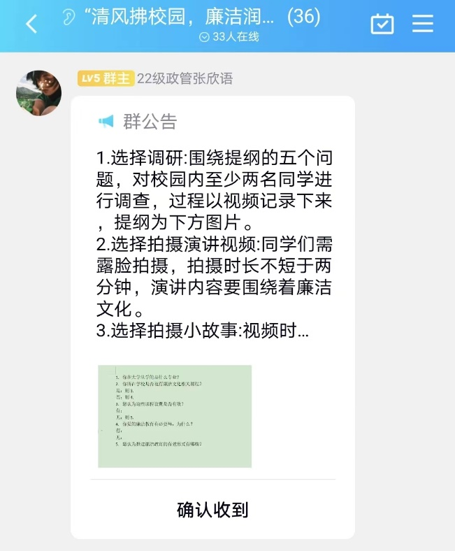 本次活动采用线上收集、投票推选的方式举行。活动负责人张欣语要求参与者以拍摄视频的方式选择参与校园廉洁调研、廉洁故事拍摄或廉洁文化演讲形式,鼓励同学们积极参加活动,传播廉洁文化。选择校园廉洁调研的同学主要围绕“学校是否开设廉洁文化相关课程“课程设置是否有效”、“对廉洁文化的宣传有何见解”等问题由浅入深地进行采访询问,徐雪岩在采访中表示要坚决抵制腐败思想,做廉政文化的坚实捍卫者。选择制作廉洁视频的同学,积极搜寻网络素材,并加以自己的理解感悟,李慧轩在视频中表示,要时刻绷紧廉政建设这根弦,秉持家国情怀,坚定理想信念,充分展现出当代大学生的良好风貌。选择廉洁文化演讲的同学条理清晰,思维创新,言简意赅的表达出廉洁文化在新时代的意义,弘扬了清风正气。随后,张欣语组织大家进行匿名投票,2022级4班张欣语、杜莹莹与马晓晴的作品评选为此次活动的优秀作品。