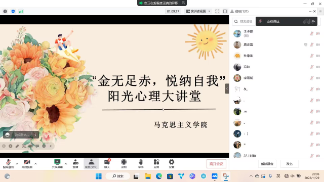 为丰富学生的课余生活,提高同学们的自我接纳与心理抗压能力,12月2日,马克思主义学院于线上举办“金无足赤,悦纳自我”阳光心理大讲堂活动,教育科学学院研究生曹欣欣担任主讲人。