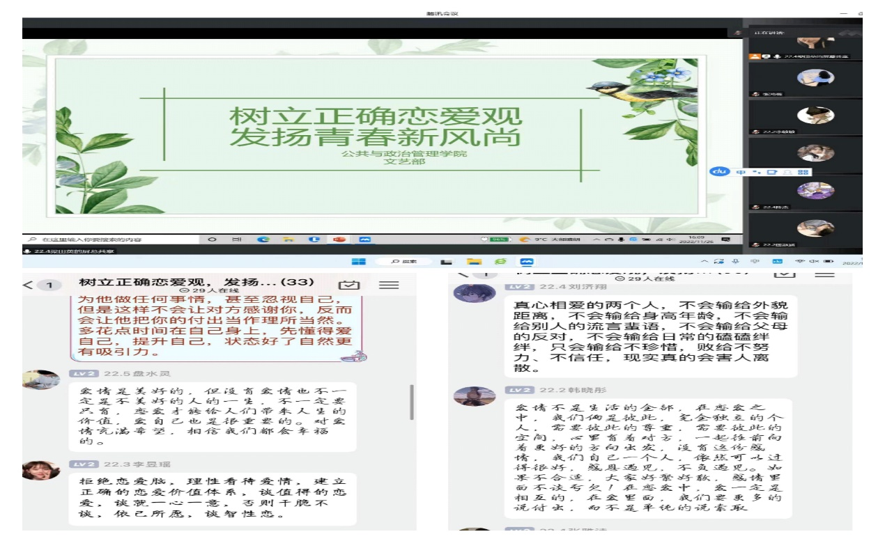 为摆正同学们的恋爱心态,帮助同学们树立正确的恋爱观,妥善处理好学习与恋爱的关系,12月5日,政治与公共管理学院文艺部于线上举办“树立正确价值观 ,发扬青春新风尚”思想成长活动。