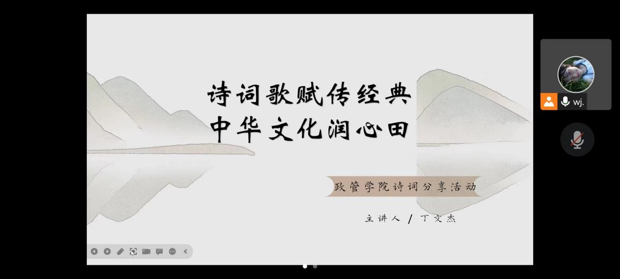 为营造浓郁书香校园氛围,传承我国优秀诗词文化,12月7日,政治与公共管理学院于线上举办“诗词歌赋传经典,中华文化润心田”诗词分享活动。