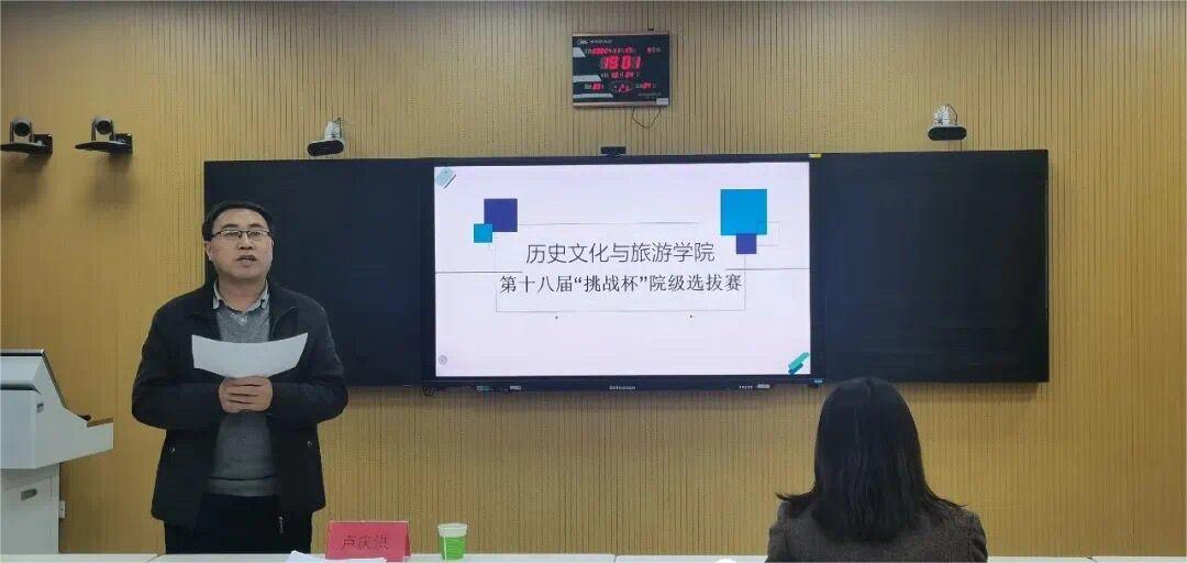 为促进我院人才培养向纵深方向发展,激发广大青年学生崇尚科学、勇于探索、锐意创新、迎接挑战的主动性,2月15日,历史文化与旅游学院于6#A301召开第十八届“挑战杯”院级选拔赛。党委副书记卢庆洪、团委书记石晓晗、副教授刘建峰、青年教师代表倪鹏担任评委老师。此外,特别邀请法学院党委副书记刘洁对此次比赛进行指导。