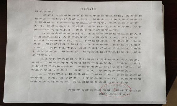 近日,法学院收到山东省济南市长清区文昌街道文昌社区居委会寄来的表扬信,对青年学子王士宇在“青鸟计划”实习实践中的无私付出表示高度认可,对学院的辛勤培育表示诚挚感谢。