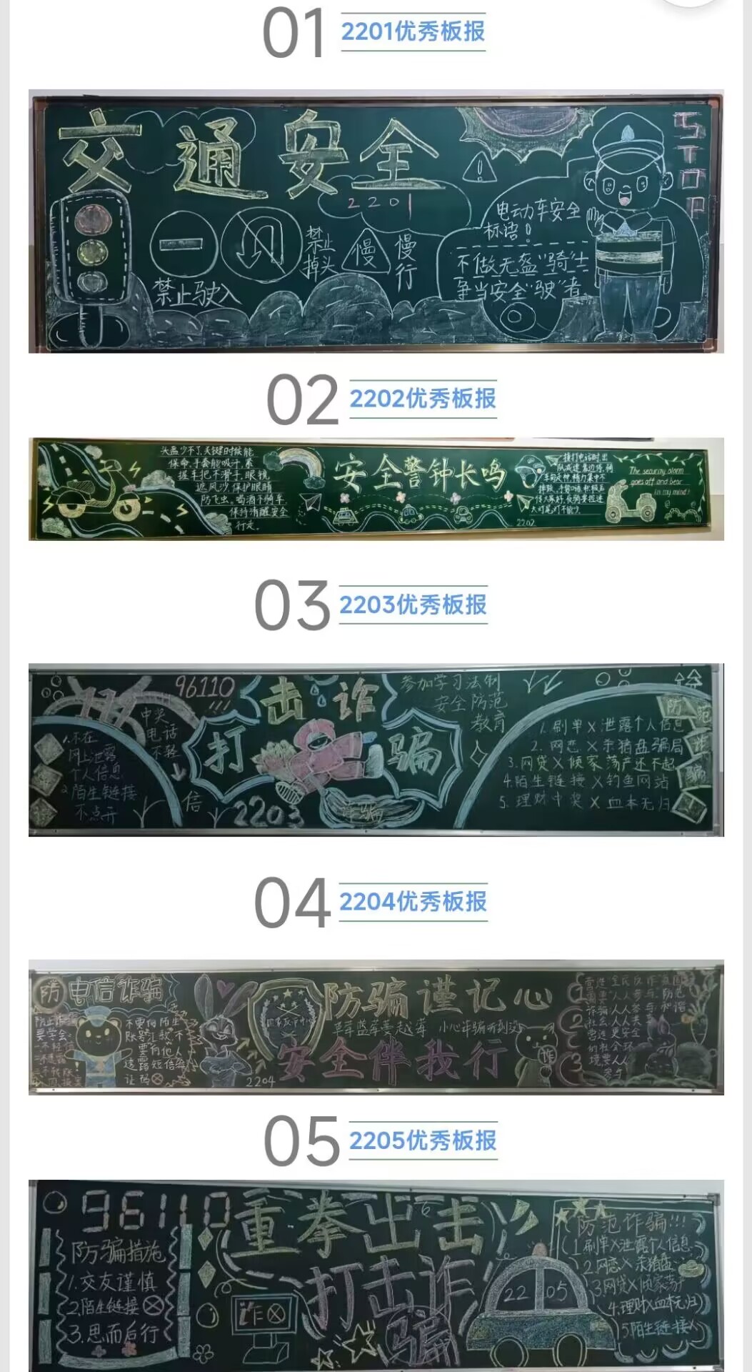 平安校园在我心,安全行动手中行。本次安全教育系列活动包括三部分。首先,学习发展部组织同学们利用课余时间,合理分工,精妙构思,最终绘制出一幅幅颜色缤纷、图文并茂的黑板报作品。2022级5班的板报重点突出,表意明确,以“交通安全伴我行”七个大字为主体,用斑马线、红绿灯等元素表现遵守交规,安全骑行的主旨。2022级4班的板报作品图文并茂,众彩纷呈,围绕疫情防控这一中心,绘制生动形象的迷你病毒和医护人员形象,为同学们重点科普防疫相关知识并介绍日常防疫措施。2022级3班同学的板报标新立异,特色鲜明,通过一只引人注目的企图抓取纸币的手,以及四个占据画面中央的红色大字“预防诈骗”突出防范电信网络诈骗内容,从而达到安全教育目的。此外,学习发展部成员们在教学楼停车区域悬挂横幅,并提醒学生佩戴头盔,减速慢行。同时开展网络宣传活动,成员们在易班软件上发布采用动画形式的安全教育视频,使宣传内容更具可读性和观赏性,对学生进行交通安全、防疫要求和预防校园贷陷阱等方面知识科普。在接受系列活动的教育时,学生们颇有感悟,并分班上交了针对安全教育的体会心得。