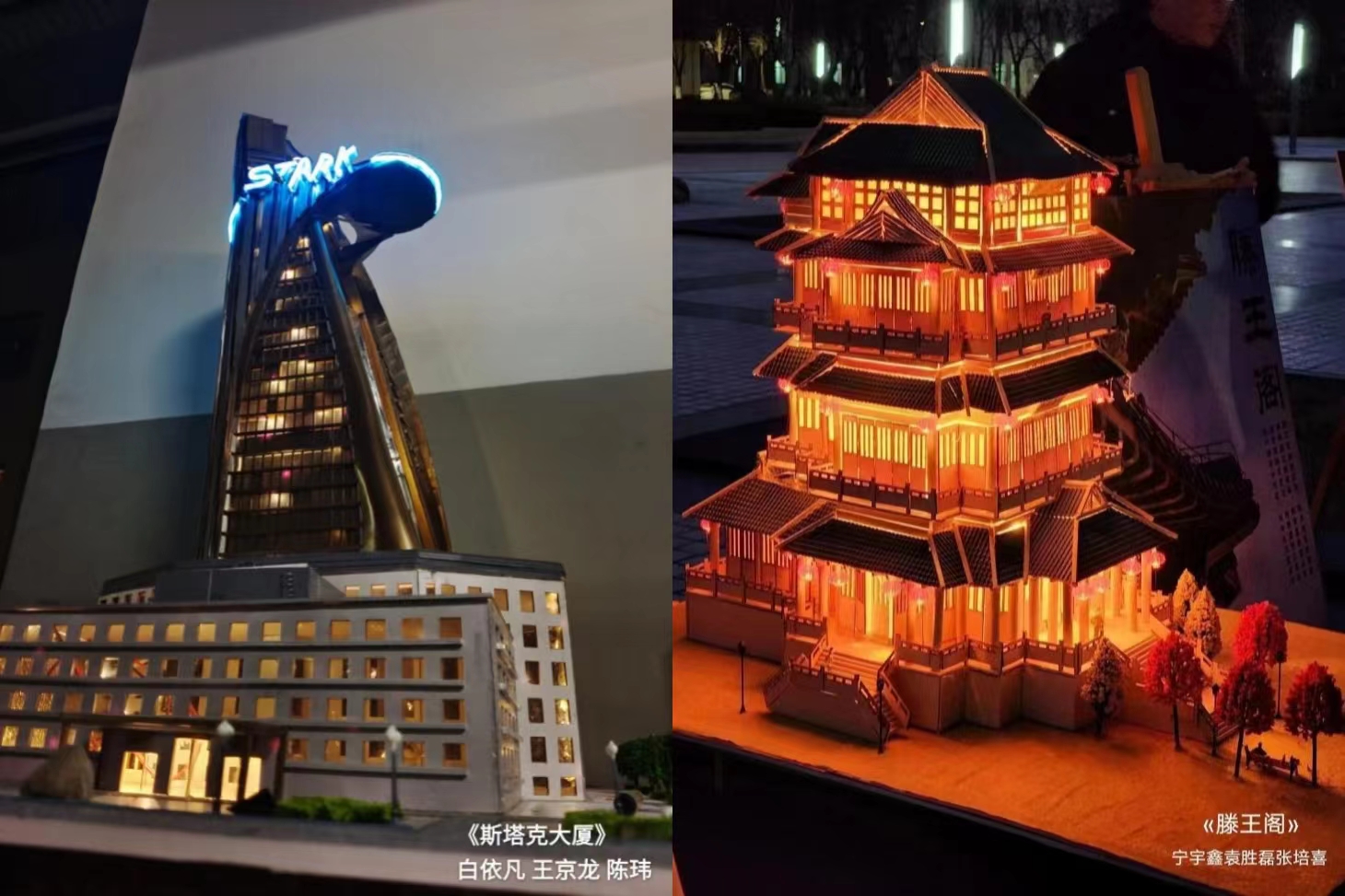 滕王阁组制作成员宁宇鑫谈到:阁以文传,一序千年。我们以中华传统建筑滕王阁为原型创作此作品,采用纯木质结构,深刻让我们感受到中式建筑的气魄宏伟,古代匠人的良工心苦。小组成员搜集资料,从地基出发,层层延伸,精确到阁楼中一梁一柱,精致的内部结构与外部轮廓,配合夜晚灯光,仿佛使人们身临其境,亲临滕王阁。