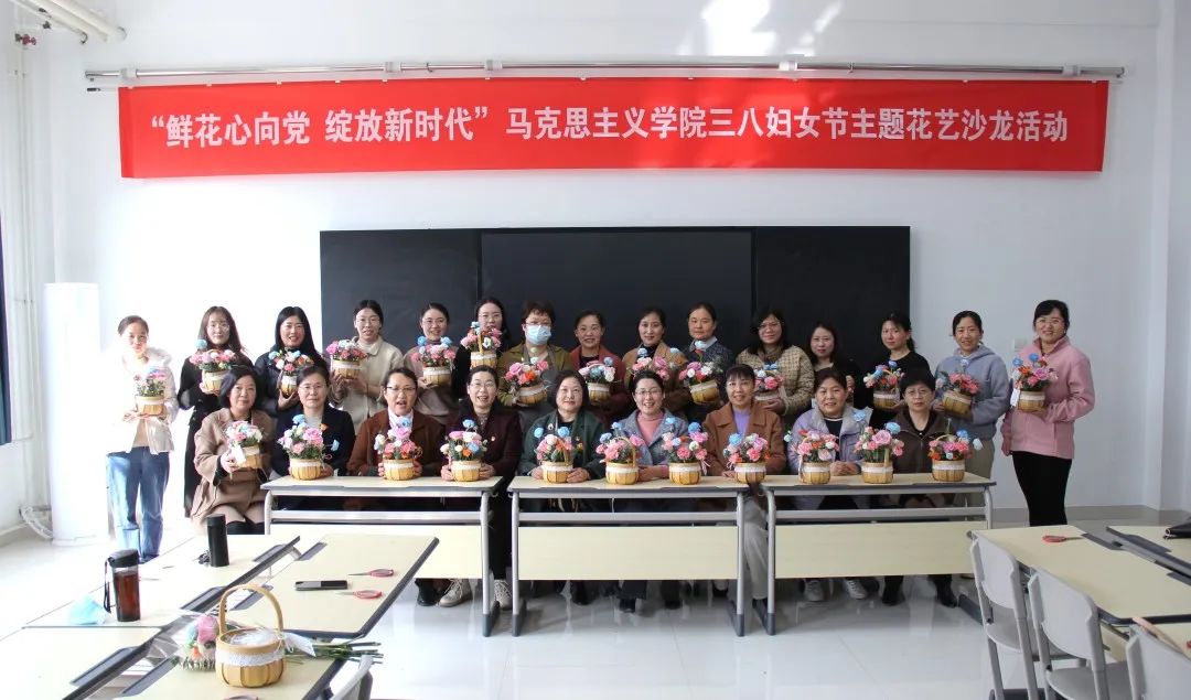 为庆祝第113个“三八”国际妇女节,进一步丰富女教职工精神文化生活,马克思主义学院工会组织举办“鲜花心向党 绽放新时代”三八妇女节主题花艺沙龙活动,组织学院全体女教职工共同学习花艺技法,学院党委书记张华筠出席活动并代表学院党委领导班子向全体女教职工送上亲切的慰问和祝福。