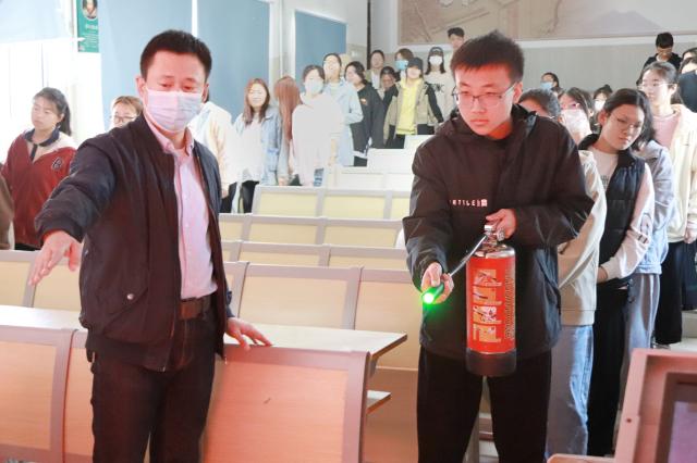 防范未“燃”齐用心,校园防火共安宁。本次活动分为消防讲座和实操演练两个部分。讲解员结合自身消防工作经验和校园真实案例,从火灾分类、火灾案例、法规责任、安全提示和应对措施等方面讲解消防安全知识。在此基础上,讲解员重点强调拨打119报火警时的注意事项,叮嘱学生在报火警过程中沉着冷静,清晰说明失火地址、起火部位以及火势情况并留下姓名和联系电话,方便消防人员迅速赶到现场,进入最佳位置实施救援。同时,讲解员借助校园火灾事故现场照片,让学生直观感受消防技能缺失带来的惨痛后果,倡导学生强化消防安全意识、自觉学习消防知识、遵守学校相关消防规定,以实际行动做消防安全的践行者。在实操演练环节,讲解员借助模拟设备,现场示范灭火器的提、拔、握、压四个动作要领,指导学生灭火器的使用方法,亲身感受灭火过程。活动结束,同学们纷纷表示本次活动很有教育意义,在学习消防知识和操作消防器材的同时深刻体会到消防安全的重要性。
