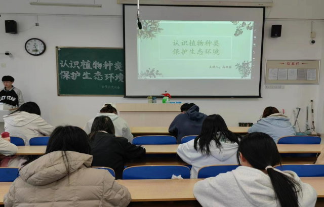 主持人马艳菲通过播放幻灯片和视频,围绕“植树节”的历史渊源、发展历程和植树成就三个方面向活动参与者展示生态系统中的各类常见植物和濒危植物,使同学们更加熟识各类植物的习性和特点。随后,进入“猜植物名称”游戏环节,马艳菲向同学们展示生活中常见的植物照片和植物习性,大部分同学都能根据活动中所学的植物知识和部分生活常识,辨认出展示的植物名称。李思云、张燕等同学分享了许多带有植物名称的古诗词,如“竹外桃花三两枝,春江水暖鸭先知”,“不经一番寒彻骨,怎得梅花扑鼻香”,“庭下如积水空明,水中藻荇交横,盖竹柏影也”等著名诗词句,展示了丰富的知识储备。丁文杰表示,通过参与本次活动学到很多植物知识,认识到植物与人类生存和生活关系密不可分,植绿、增绿、爱绿、护绿,做绿色文明使者是我们大学生应尽的责任。