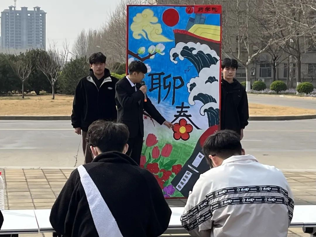 活动开始之初,由各院代表抽签决定绘画完成后的解说顺序,每支队伍需提交一份紧扣“华夏展姿擎春意,齐聚聊大赴远航”的展板设计稿,绘画完成后由成员围绕主题解读和设计理念进行宣讲展示。比赛正式开始,我院成员提前准备好颜料和工具,进入绘画过程,成员选取代表性的党的二十大红色主题与聊城大学春天相结合的特色展板设计。各小组成员分工默契,互相配合对展板进行设计与创作,小组成员在聊城大学春天的基础上,通过体现春天的特征,将党的二十大的精神与其相贯彻,并运用纸浆画与我国传统晕染的特色画法与其相融合。绘画过程结束后,由各学院依次进行设计理念的讲解,我院对稿件的构思设计以及特色运用展开讲解,从“我国、我党、我校、我们”四个方面进行创作的阐述,踏着党的二十大的春风,迈向新的时代。评委仔细听讲,并对作品进行评分,讲解结束后,组织人员根据评委的打分分别排出一、二、三等奖。最后,比赛将至尾声,我院于本次比赛荣获二等奖的优异成绩。