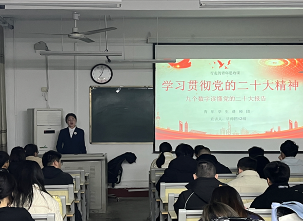 为深入贯彻习近平新时代中国特色社会主义思想,学习党的二十大精神,引导青年学生坚定不移跟党走,切实提高外国语学院青年学生的思想政治素养、理论水平、创新能力和实践能力,外国语学院于3月20日在#1A112教室开展学习贯彻党的二十大精神主题宣讲活动。本次活动以“九个数字读懂党的二十大报告”为主题,邀请政治与公共管理学院青年讲师团成员为主讲人,外国语学院本、硕学生骨干、各年级班团成员参加本次活动。