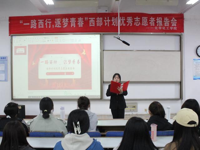 以青春之名,赴西部之约。为鼓励大学生积极投身实践,弘扬扎根边疆、服务祖国的奉献精神,使大学生更好的了解“西部计划”的相关知识及注意事项,3月23日,化学化工学院于4#C205举办“一路西行,逐梦青春”西部计划优秀志愿者报告会。本次活动特邀2019届优秀毕业生李梅进行宣讲,化学化工学院团委书记刘丽霞主持本次活动。