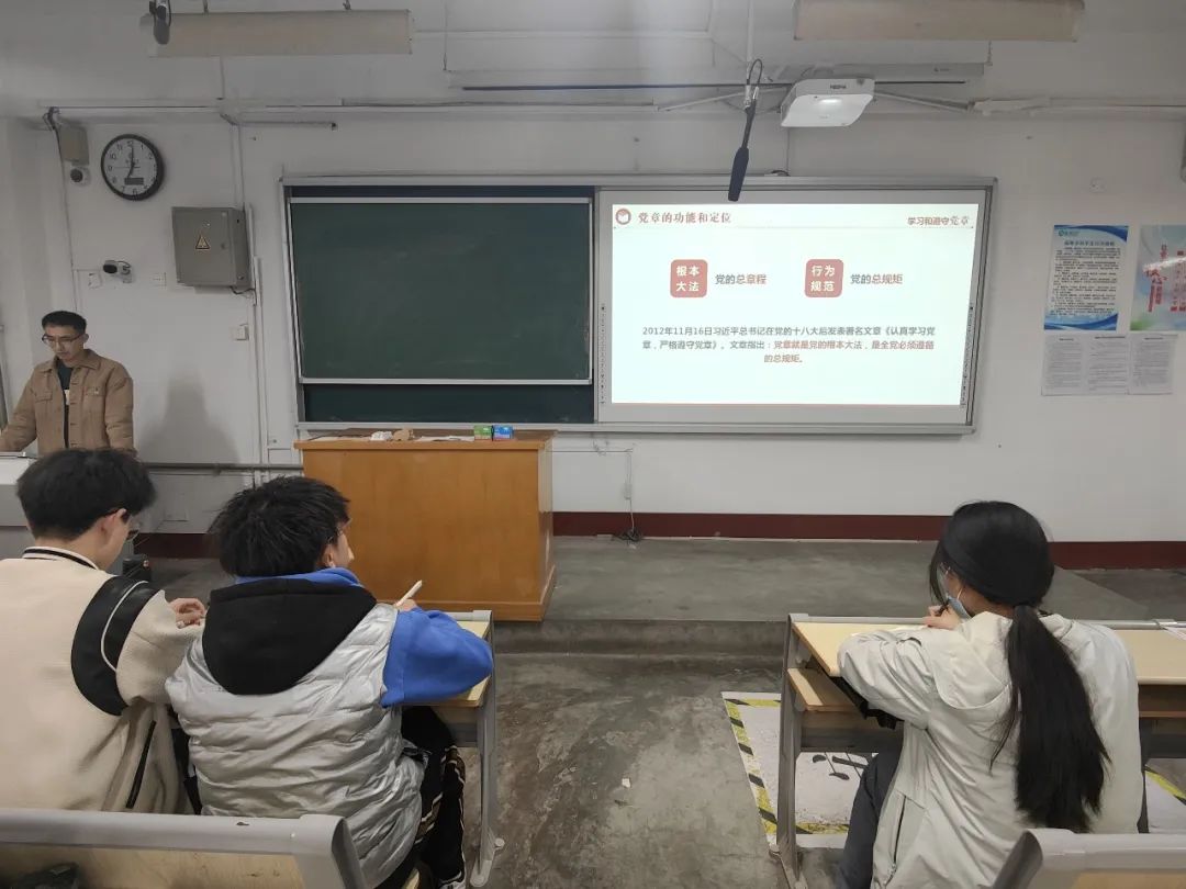 本次会议主要围绕“中国共产党章程”与“四讲四有”两个主题展开。徐志远老师为入党积极分子们讲述了中国共产党章程的概述,他强调认真学习党章、严格遵守党章,是加强党的建设的一项基础性经常性工作,也是全党同志的应尽义务和庄严责任,对强化全党党章意识,增强党的创造力、凝聚力、战斗力具有极为重要的作用,作为入党积极分子必须严格遵守并执行。随后,他向入党积极分子介绍党章的发展历程并讲述了党中国共产党第一个纲领、党的二十大对党章做的重要修改等重要内容。接着他对四讲四有做出详细阐释,勉励入党积极分子自觉践行社会主义核心价值观、自觉投身工作一线,积极践行四讲四有,争做讲政治、有信念,讲规矩、有纪律,讲道德、有品行,讲奉献、有作为的合格党员。入党积极分子认真听课并做好党课笔记,纷纷表示自己将心怀家国情,永远跟党走,发扬党的优良传统和作风,自信自强、守正创新,在奋发有为中筑牢信仰之魂。最后,入党积极分子收看了以“中共二大会址纪念馆:首部党章的诞生与保存”、“中共二大会址纪念馆首部党章的诞生与保存”。