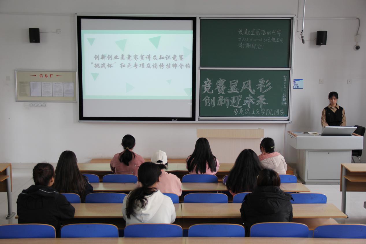 3月25日,马克思主义学院于东校区C#503举办“竞赛显风彩,创新迎未来”活动,通过PPT讲解与知识竞赛相结合的方式,深化同学们对“挑战杯”红色专项及揭榜挂帅赛事的认识,激励我院学子积极奋进、勇于创新,提高同学们参加创新创业竞赛的积极性。