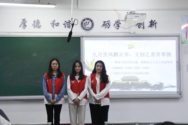 本次宣讲以“九万里风鹏正举,文创之责吾辈挑”为主题,以“推进文化自信自强,铸就社会主义文化新辉煌”为主线,展开理论宣讲。张芳圆从党的二十大报告中的新观点、新论断、新思想出发,通过九个关键数字带领同学们重温党的二十大报告,深入学习领会党的二十大精神。任慧莹围绕文化自信的底气何来、底蕴何在、底色何绘三个方面,深刻阐释了文化自信之根、文化自信之魂、文化自信之基。印珂萌强调,广大青年应认真学习马克思主义指导思想,深刻领会其内涵及精神实质,用以爱国主义为核心的民族精神和以改革创新为核心的时代精神鼓舞斗志,使自己时刻保持昂扬向上的精神状态。宣讲过程中,同学们专心听讲、认真记录、积极反馈,展现了同学们对于加入党组织的坚定信念和迫切心情。
