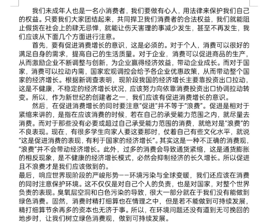 活动开始,负责人向同学们发放公告介绍了活动以增强大学生维权意识为目的所开展,讲述了3.15日消费者权益日的来历以及同学们上交征文的注意事项和评选标准。随后,同学们积极参与并准时准点上交了征文作品,各个征文作品都有独特见解,内容丰富多彩,事件跌宕起伏。其中有一篇讲述自己因维权知识缺失而使自己处于被动局面,利益受损,从自身经历谈起,情节充实,情感丰富,真正从社会生活中选取事件,感悟到维权意识的重要性,并且还提供了一定的维权建议,给人留下深刻印象,与读者产生共鸣,更好的鼓舞人们的维权行动,维护自己合法权益。活动在接近尾声时,负责人将作品的新颖性、生动性及与主题的符合程度进行评比。