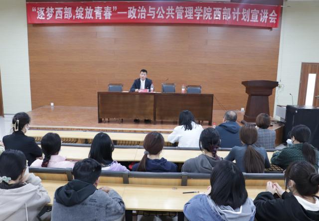 为响应国家号召,弘扬志愿精神,建设美丽西部,进一步做好大学生志愿服务西部计划工作,4月2日,政治与公共管理学院于6#c106举办“逐梦西部,绽放青春”西部计划宣讲会。本次宣讲会邀请了校西部计划项目办、校团委志愿工作部部长荣存福和优秀西部计划志愿者代表李英志、辛德相担任主讲人,政管学院优秀学生代表参会。