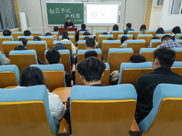 袁明鑫就双庙康城社区的实际情况向同学们分享工作经验,从疫情防控采取的措施和取得的成就出发,再现社区工作的真实场景。双庙康城社区积极响应创建文明城市的号召,移走“垃圾山”,还居民生活好环境。针对老旧小区改造问题,社区工作人员深入群众,听取居民意见,召开“百姓说事 干部解题”民情恳谈会,主动慰问困难群体,帮助居民圆了“暖冬梦”。在社区建设方面,双庙康城社区强调党建引领聚合力,共建融合促发展。袁明鑫提到,丰富多彩的社区活动能够增加居民之间的凝聚力,也是促进社区和谐发展必不可少的环节。他以幽默诙谐的方式展现社区工作的具体内容,让同学们更近距离地了解社区工作。同学们聚精会神地聆听,不仅学习到了社区工作的基本知识,更感受到了社区工作人员的辛苦。袁明鑫鼓励同学们争做新时代的合格青年,坚定理想信念,积极投身社区实践,为社区建设贡献青春力量。