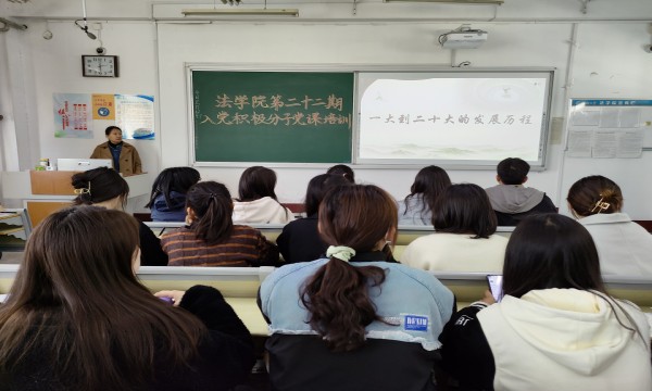 4月7日,法学院于西校区10#C624举办第二十二期入党积极分子党课培训,法学院党委副书记、副院长刘洁担任培训主讲人,64名入党积极分子参与培训。