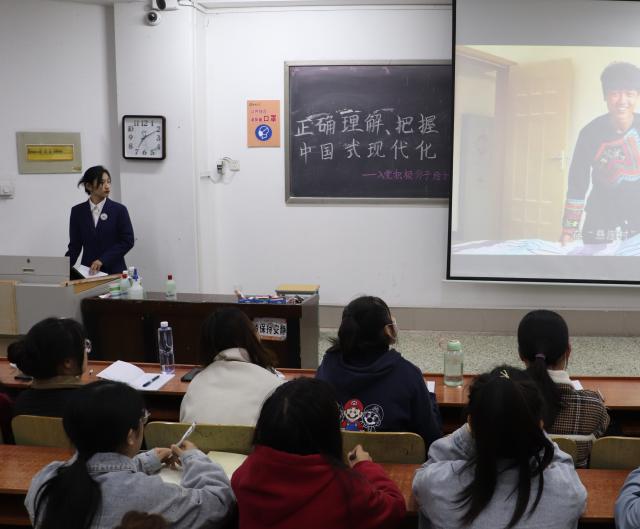 宣讲中,杨红伟以党的二十大报告中“中国式的现代化”为主题,带领大家一起学习党的二十大精神。杨红伟从“伟大征程——含义及历程”和“崭新画卷——五大特征”两方面详细介绍中国式的现代化,让参与者进一步认识和了解中国式的现代化。“中国式的现代化”是中国共产党领导的社会主义现代化,其发展历程曲折艰辛,但在中国共产党的带领下,人民高举马克思主义伟大旗帜、注重以习近平新时代中国特色社会主义思想指导中国新时代、新特点的伟大斗争,坚持中国式现代化的探索和发展。杨红伟提到中国式现代化的五大特征,即人口规模巨大的现代化、全体人民共同富裕的现代化、物质文明和精神文明相协调的现代化、人与自然和谐共生的现代化和走和平发展道路的现代化。坚持中国式现代化,全面建设社会主义现代化国家,参与者孙瑞瑞表示,通过本次活动明白,青年学子必须增强忧患意识,坚持底线思维,做到居安思危、未雨绸缪。