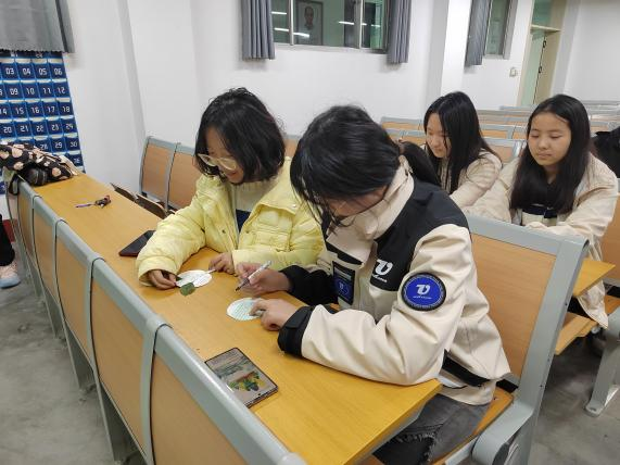 活动伊始,负责人组织同学们上台抽取作品讲解顺序,待主持人介绍完活动流程后,活动正式开始。本次活动分为两个环节:第一个环节为手工制作,同学们充分发挥自己的想象力和创造力,将纸板裁剪出棒棒糖的模样,并用胶水小心翼翼的将飘落的花瓣和绿叶粘贴在纸板上。作品完成后,从创造材料和作品寓意两方面书写小卡片,介绍自己制作的植物棒棒糖;第二个环节为作品讲解,有的同学引用诗句“一角阑干聚落花,此是春归处”,将传统诗句和花瓣制作的植物棒棒糖结合,传递春日落花的浪漫,有的同学利用桃花花瓣在纸板上粘贴出一束玫瑰的模样,令人眼前一亮,有的同学把绿叶拼接成大树的模样,并用花瓣点缀,展现出“一树繁花盛开”的美好景象。随后,同学们手持精美的植物棒棒糖,用饱满的感情朗读自己书写的作品简介,一字一句,洋洋盈耳,令人不禁赞叹。活动最后,评委对作品进行点评,夸赞同学们的动手能力和创造力,并引导同学们去亲近自然,感受自然之美。