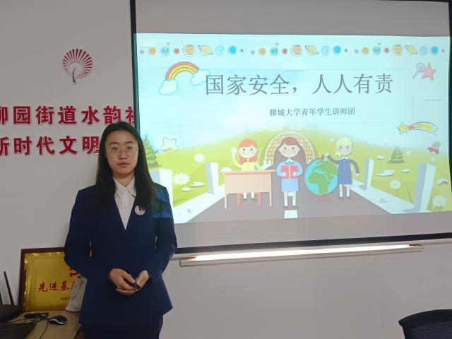 4月15日,聊城大学青年学生讲师团应邀赴柳园街道水韵社区进行宣讲,宣讲题目是“国家安全,人人有责”,讲师团成员谢梦洁、袁凌云担任主讲人。