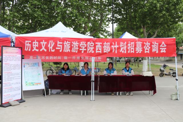 为进一步做好大学生志愿服务西部计划工作,号召更多的青年学子到基层、到西部去受教育、长才干、做贡献,4月21日至22日,历史文化与旅游学院于逸夫图书馆前举办西部计划招募咨询会。