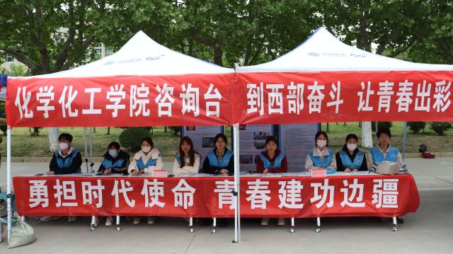 为积极响应“到西部去,到基层去,到祖国最需要的地方去”的时代号召,培养当代青年“奉献、友爱、互助、进步”的志愿服务精神,进一步做好2023年西部计划宣传招募工作,4月21日-4月22日,化学化工学院于东校区逸夫图书馆前举办“到西部奋斗,让青春出彩”2023年大学生志愿服务西部计划招募咨询会。