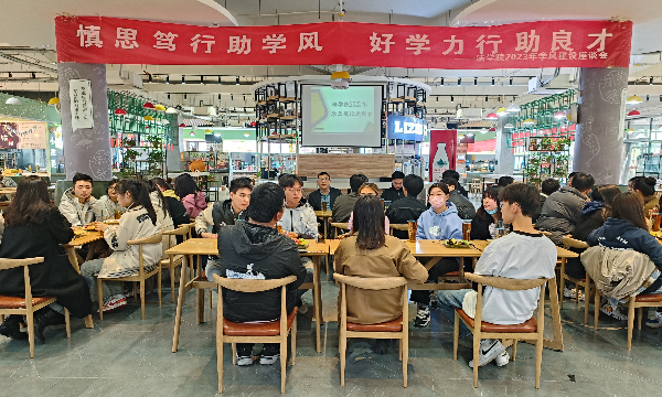 4月24日,法学院于西校区湖苑餐厅一楼举办以“慎思笃行助学风,好学力行助良才”为主题的学风建设餐厅沙龙,法学院党委副书记、副院长刘洁,副院长刘海江,团委书记刘凤芹,辅导员孙曦、张雅琪及各年级班团成员参与此次活动。