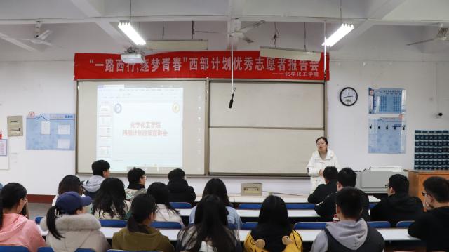 以青春之名,赴西部之约。为深入学习贯彻习近平总书记关于青年工作的重要思想,帮助学生了解“西部计划”方面的相关知识及注意事项,进一步推动化学化工学院西部计划相关工作的实施,4月24日,化学化工学院于4C#105举办“一路西行,逐梦青春”西部计划志愿者报告会。本次活动特邀2019届西部计划优秀志愿者李轩喆作为主讲嘉宾,化学化工学院团委书记刘丽霞出席参加。