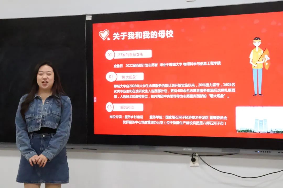 本次宣讲会采取线上与线下相结合的方式进行。会议邀请到2022届西部计划志愿者金鲁哲为同学们进行线下宣讲,活动伊始,金鲁哲向大家做了自我介绍并讲述了自己是如何与西部计划相知相遇的。紧接着,金鲁哲分享了自己的西部志愿经历,讲解了西部计划的相关政策,包括考公考研的优惠政策、日常生活保障等,让同学们更加了解了西部计划与西部生活。