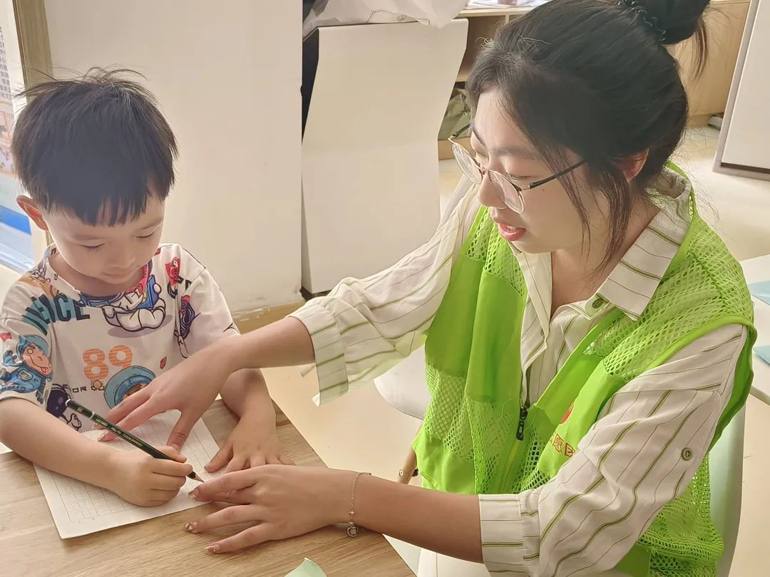 本次活动以“翰墨伴童年,练字促成长”为主题,志愿者以书法的悠久历史为切入点,为小朋友们讲述了学习书法的好处以及作为中华儿女学习和传承书法文化的必要性。随后,志愿者们从坐姿、握笔姿势开始,一步步规范小朋友们的书写习惯,并耐心向他们讲解生字基本笔画长横的书写,示范部分字的笔画,循序渐进地指导小朋友们练习书法技巧。志愿者们还通过“画蚊香”、“画楼梯”等方法锻炼小朋友们的控笔能力,教会他们基础笔画的运笔规则。在讲解过程中,孩子们全神贯注地听讲,一笔一划认真临摹,反复练习,劲头十足,志愿者们不时地指导他们临摹,纠正姿势,解答疑惑,现场书香味浓郁。