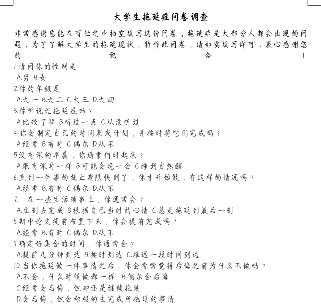 本次活动旨在帮助同学们正确认识拖延的危害性、改变自己的拖延行为,引导同学们养成良好的时间管理习惯。负责人组织参与者制作调查问卷,撰写调研方案,引导大家从中获取相关知识,并规定好调研活动的集合地点和时间。参与者于卧龙广场集合后,自行组队前往校园各处,将自己制定的问卷分发给同学们填写,填写完毕后于卧龙广场汇总分析。