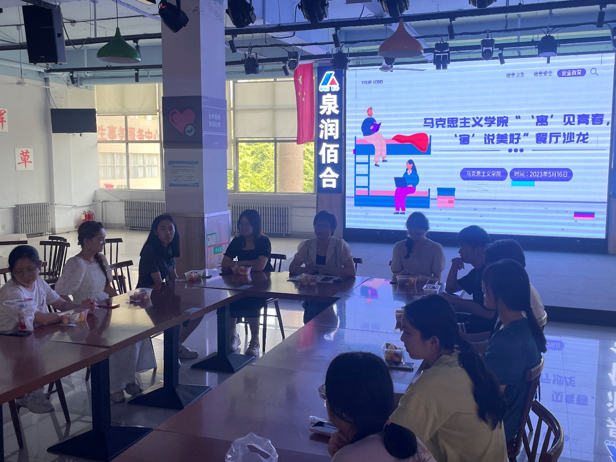 为了解学生宿舍安全情况,解决学生宿舍现有问题,向同学们传递学院的温暖关怀,5月17日,马克思主义学院于东校区翰苑餐厅二楼举办“‘寓见青春,‘宿’说美好”餐厅沙龙,马克思主义学院辅导员李洪霞及2021级、2022级部分学生代表参加。
